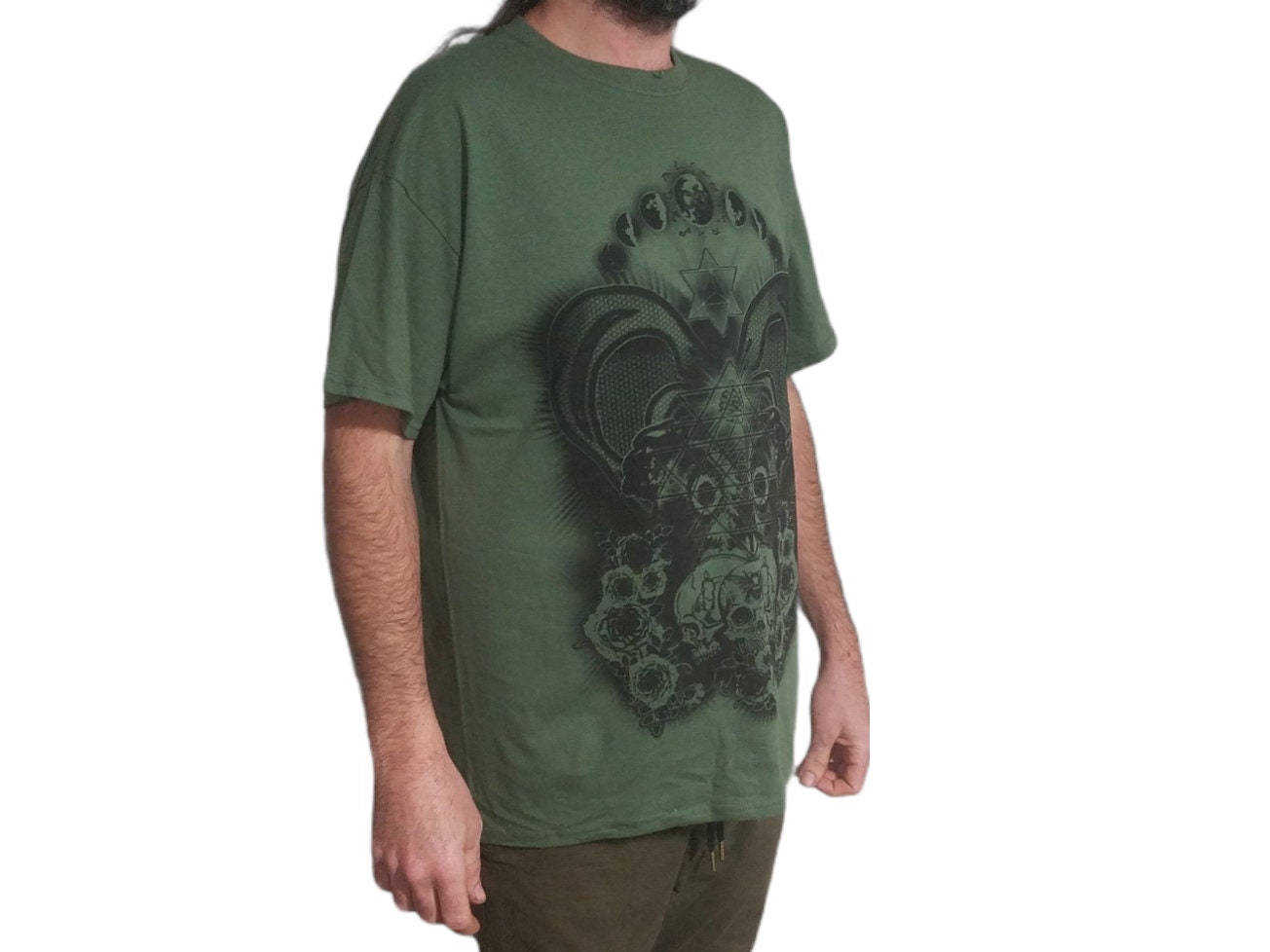 Printed in black ink on a sand or army green preshrunk 100% cotton shirt.